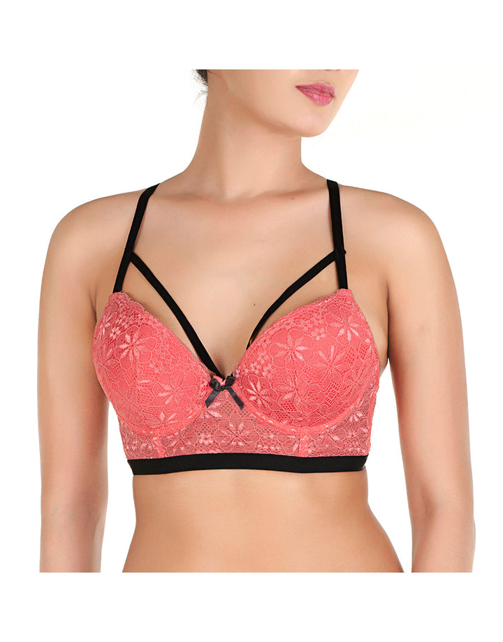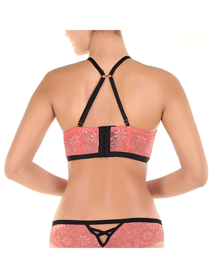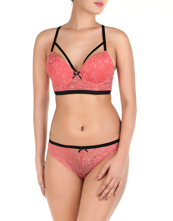 ALL OVER LACE LONGLINE CAGE CUP PUSH UP BRA SET-TEA ROSE