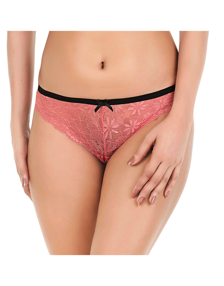 All over lace cheekini panty has a 1.5cm soft elastic waist band with a bow in the middle. This lace panty has scalloped lace edges throughout leg openings. There is a beautiful cut-out design in the middle of back right below the elastic waist band which gives it more sassy look. Waist band, bow and cut out design are in black combination. It as super soft panty with double layered gusset for comfort.
