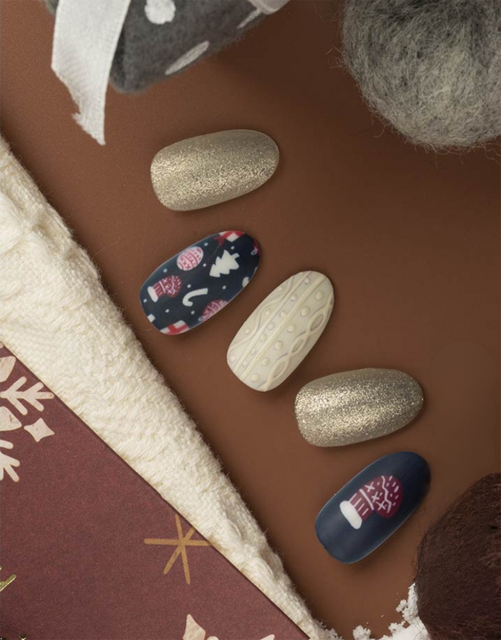 A festive nail set featuring cozy holiday elements, including a knitted sweater texture, golden shimmer, and classic Christmas icons like mittens and ornaments. A perfect blend of elegance and holiday cheer!