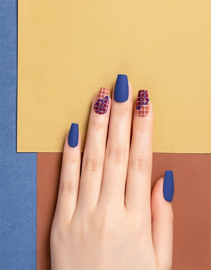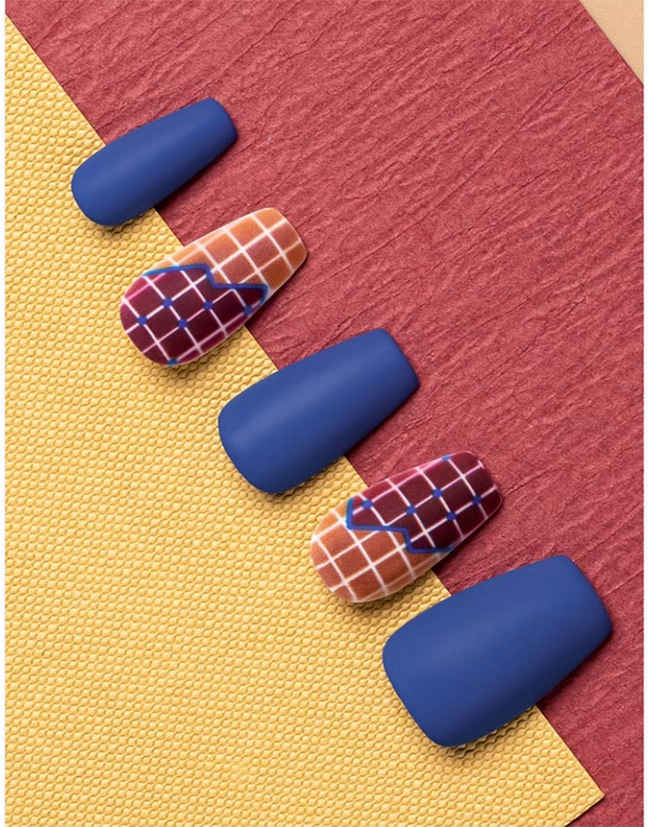 This nail set features a striking combination of deep blue matte nails paired with intricate grid patterns in warm tones of orange, red, and brown. The geometric design adds a modern, artistic touch, making it a perfect choice for those who love bold yet sophisticated styles.