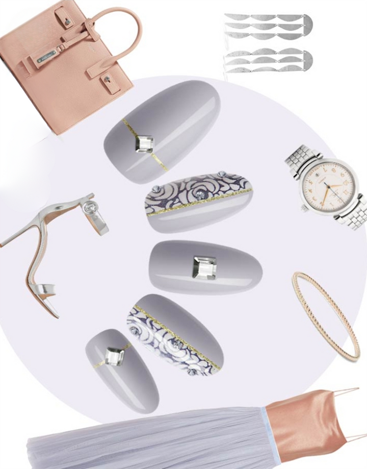 The styling inspiration surrounding the nails—featuring pastel and metallic accessories, a silky top, a flowing skirt, and classic heels—complements the refined and feminine aesthetic. This set is perfect for formal occasions, weddings, or upscale evening events.
