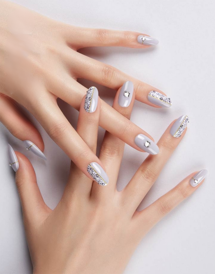 This nail design, exudes elegance and sophistication with its soft lavender-gray base, delicate lace patterns, and sparkling crystal accents. The addition of gold detailing enhances the luxurious appeal.
