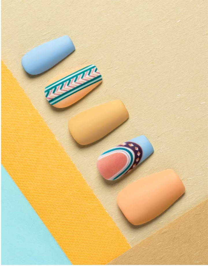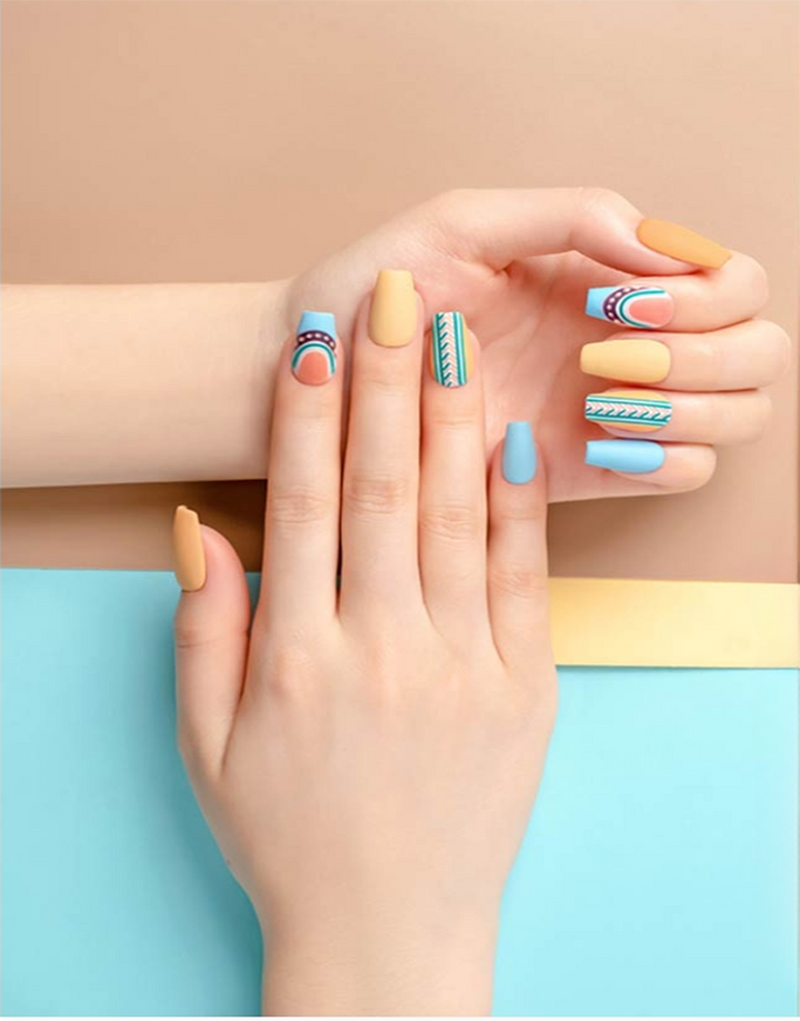 A warm and earthy mix of sandy beige, soft blue, and intricate tribal-inspired patterns. This set embodies a bohemian, sun-kissed vibe, perfect for a relaxed yet stylish look. The matte finish enhances the natural tones, making it a versatile choice for any occasion.