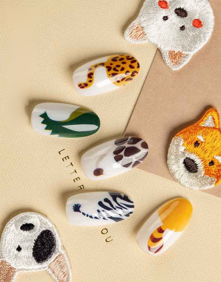 This nail print design features a playful and artistic representation of different animal patterns and tails. Each nail is decorated with a unique design resembling the tails of various wild animals, such as a leopard, giraffe, zebra, and snake. The color palette includes natural tones like yellow, brown, green, and black, creating a jungle-inspired aesthetic.