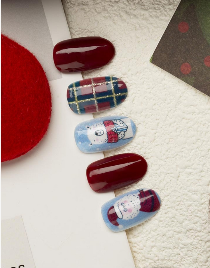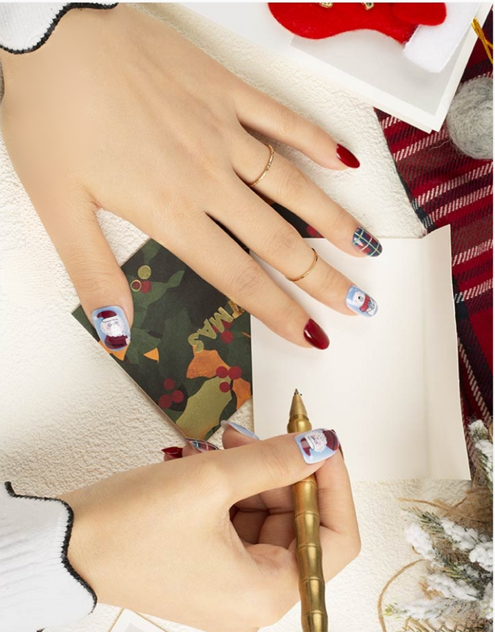 A festive nail set featuring cozy holiday elements, including a knitted sweater texture, golden shimmer, and classic Christmas icons like mittens and ornaments. A perfect blend of elegance and holiday cheer!