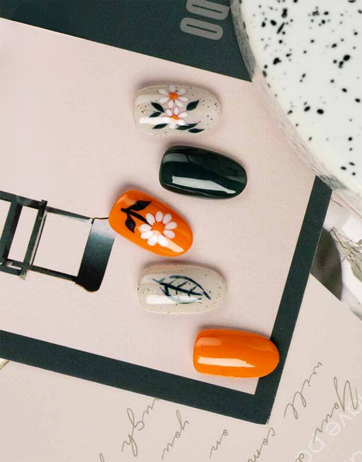 This nail print design features a beautiful combination of earthy tones with floral and abstract elements. The mix of orange, black, and speckled beige creates a striking yet elegant look. The floral patterns with daisy-like flowers add a delicate and feminine touch, while the dark green and orange nails provide a bold contrast.