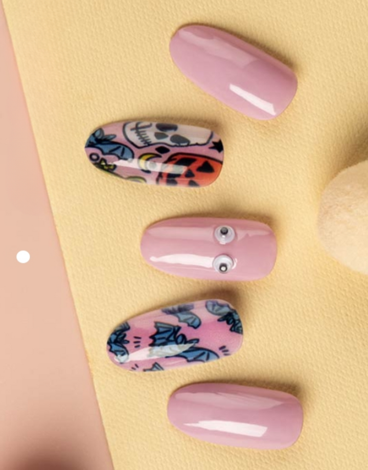 A playful and spooky Halloween-inspired nail set featuring soft pink tones contrasted with eerie yet fun designs. The set includes a skull and pumpkin illustration, flying bats, and even a pair of cute googly eyes for a quirky touch! Perfect for anyone who loves a mix of gothic, cute, and festive vibes for the spooky season