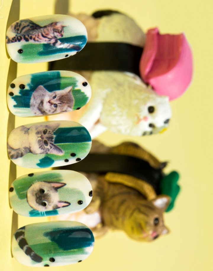 A playful and adorable nail set featuring charming kitten prints against a vibrant abstract background of green and blue brushstrokes. Delicate black dot embellishments add a fun, dynamic touch, making this design perfect for cat lovers who want a unique, artistic manicure. Whether you're a feline enthusiast or just love cute and creative nail art, "Kitty Love" is a purr-fect choice!