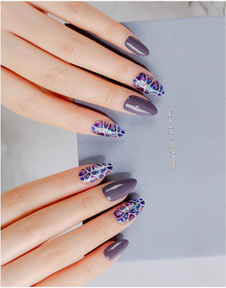 The deep, glossy purple tones combined with the intricate, shimmering stained-glass effect create a bold and artistic look