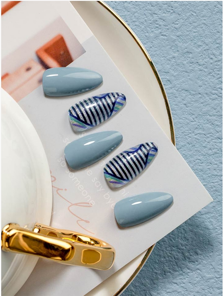 The mix of soft blue and intricate striped patterns with hints of shimmer evoke a serene yet dynamic ocean-inspired aesthetic