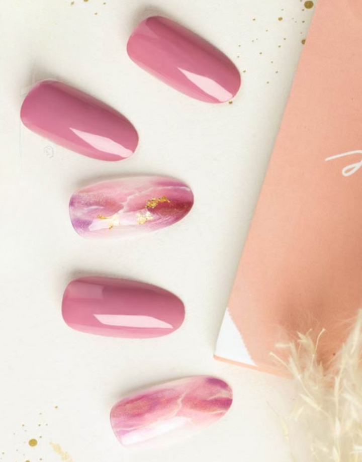 This elegant nail set features a soft pink palette with a dreamy watercolor effect on select nails, accented with delicate gold flakes. The blend of solid glossy nails and artistic, marbled designs gives a luxurious yet feminine touch—perfect for a chic and romantic look!