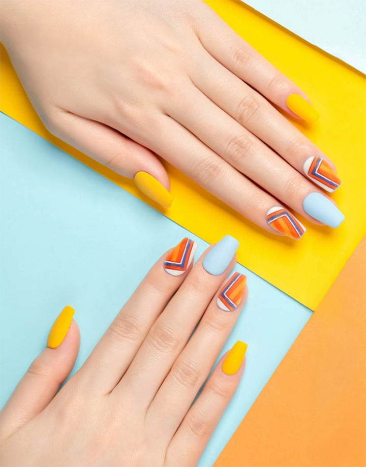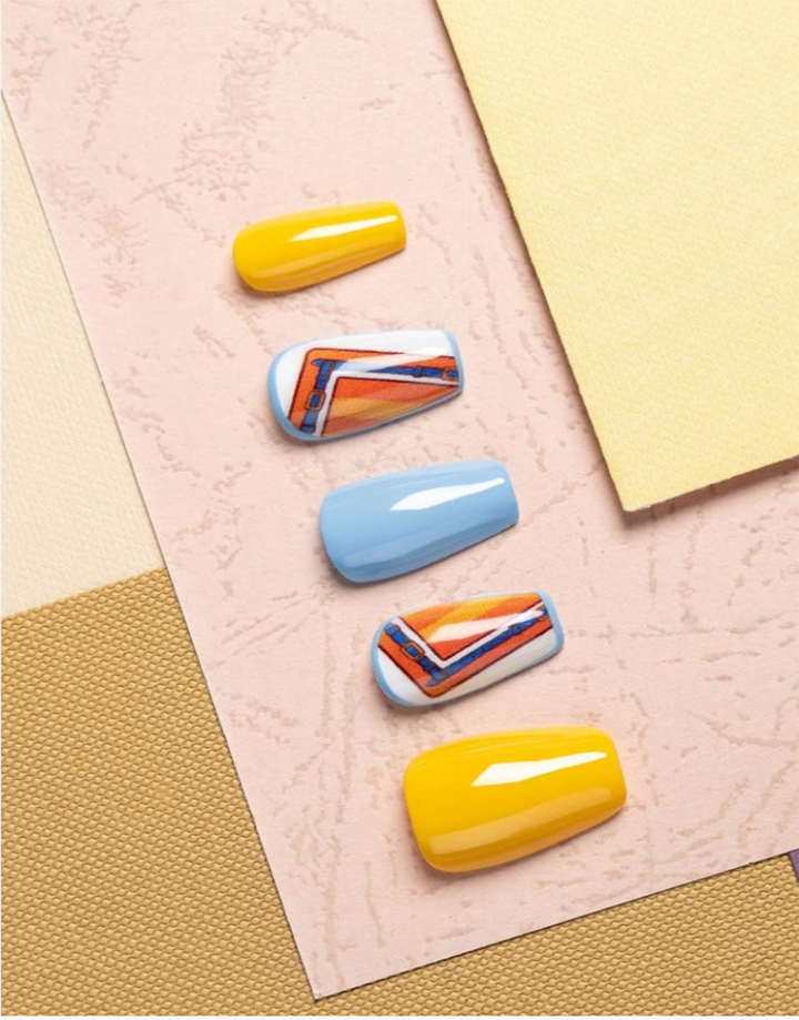 A stylish and playful nail set featuring a mix of glossy pastel blue and vibrant yellow nails, complemented by intricate scarf-inspired patterns. The detailed designs blend warm orange hues with geometric elements, adding a trendy yet elegant touch. Perfect for those who love a balance of bold colors and artistic sophistication.