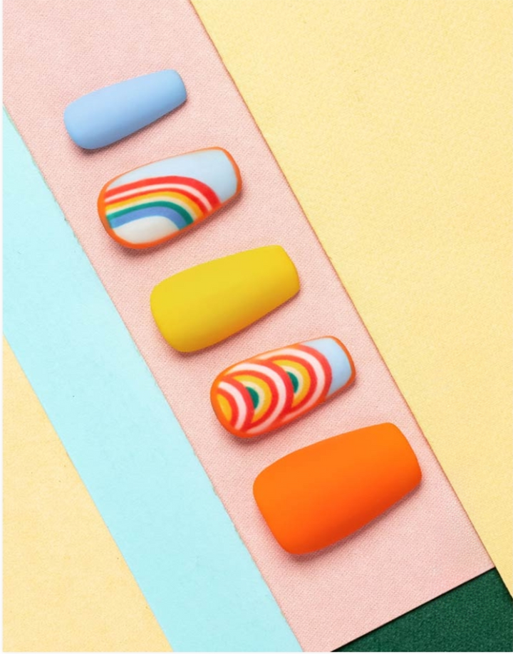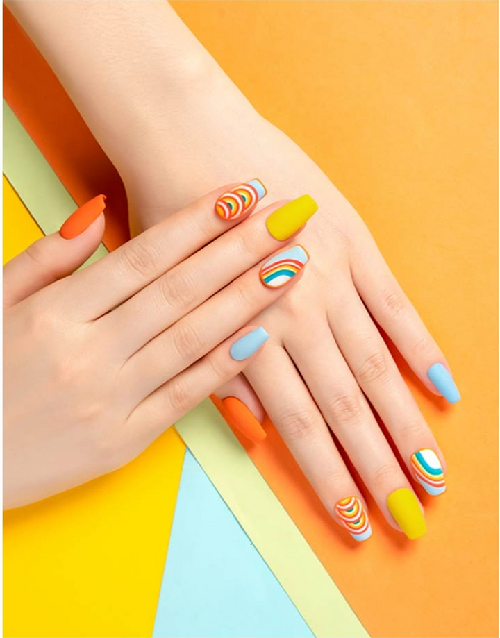 A lively mix of bright yellow, orange, and blue nails with playful rainbow swirl accents, perfect for a fun and energetic look.