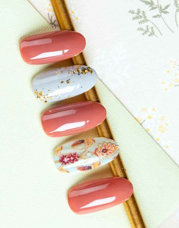 This stunning nail set features a sophisticated blend of warm terracotta tones, delicate floral patterns, and elegant gold accents. The soft contrast between muted peach and pastel blue, embellished with gold foil, adds a touch of vintage charm and luxury. Perfect for those who appreciate timeless beauty with a modern twist, this design is ideal for both everyday elegance and special occasions.