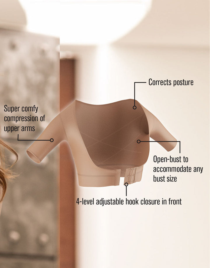 It gives dual action compresses your arm along correcting the posture. This multipurpose compression comfortably smooths your upper arms and back with a perfect seamless SkinFuse® fabric.Front hooks can be adjusted according to the level of compression required with 4 position front hook and eye closure.The criss-cross bands at the back provide support to maintain a good posture all day long. It has open bust design and accommodates any bust size so you can wear it with your favourite bra.