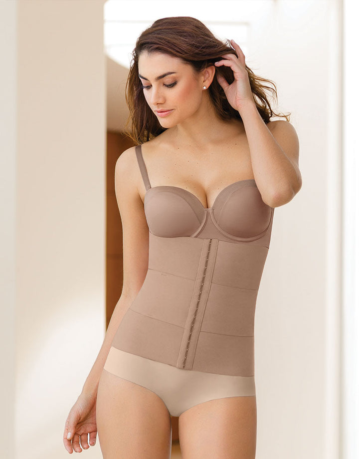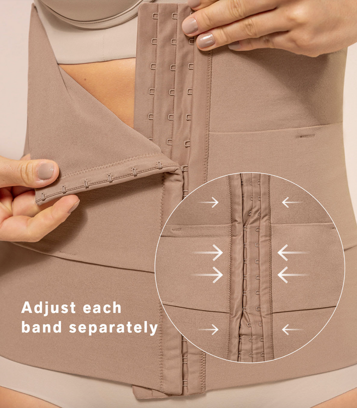 - Easy front hook-and-eye closure with 3 adjustable bands to adjust the level of compression on each part of the waist