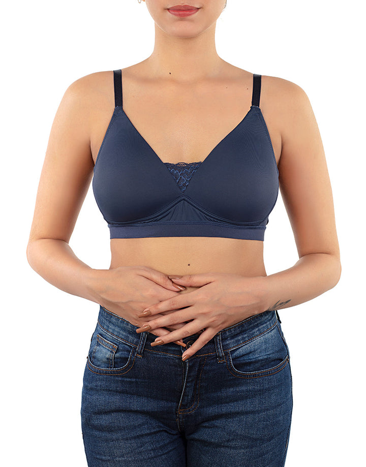 Its a triangle cup medium padded non wired t-shirt bra. Made of Nylon/Spandex. There is a same color pretty lace joining the plunge area of both the cups giving it elegant look. It has wide waist band which gives this bra good grip on the waist. You can wear it as daily basic bra for maximum comfort throughout the day.
