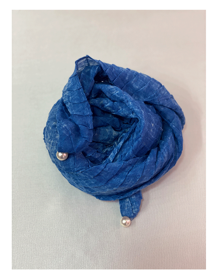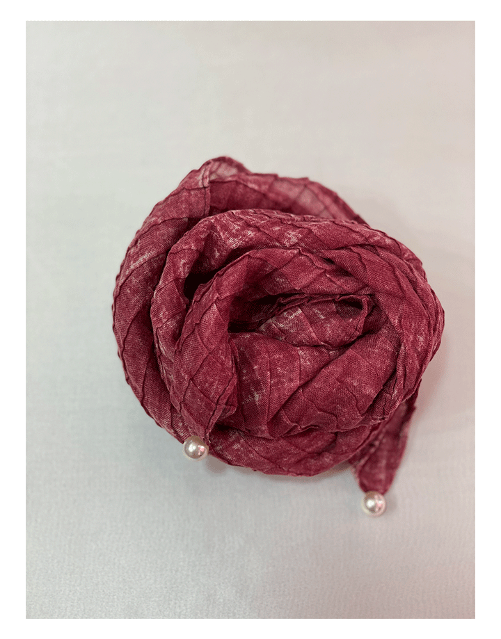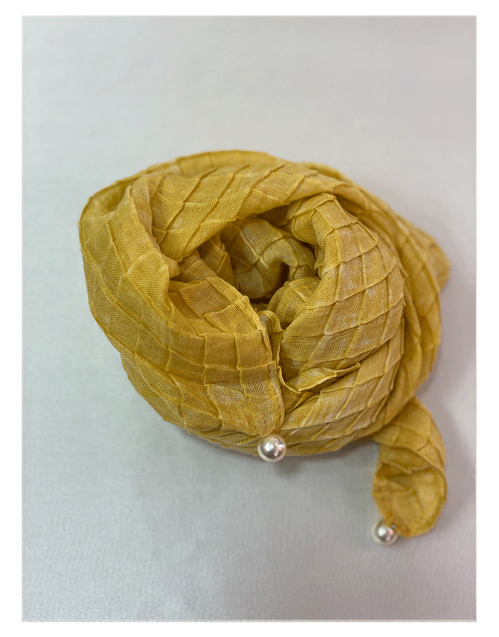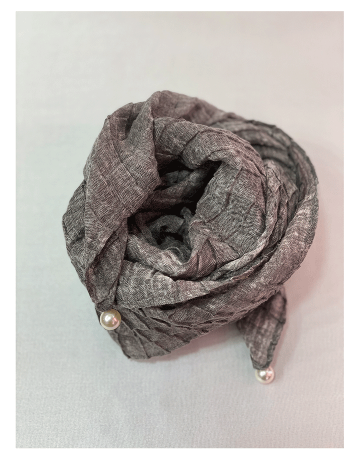 - This bandana / scarf is made of very soft and comfortable material. Made of 100% silky feel brushed polyester but super soft and comfortable. Lightweight and easy to carry if you want to cover up your hair or just wrap around your neck. It has crushed cheque kind of self print. And pearls are hanged on two corners