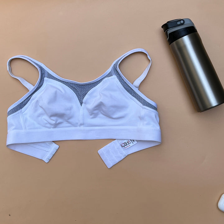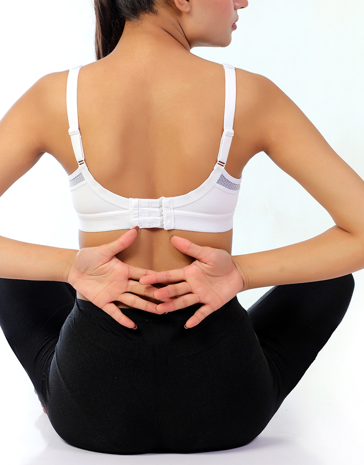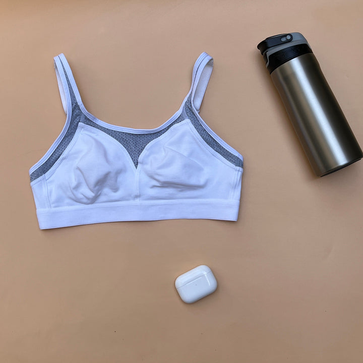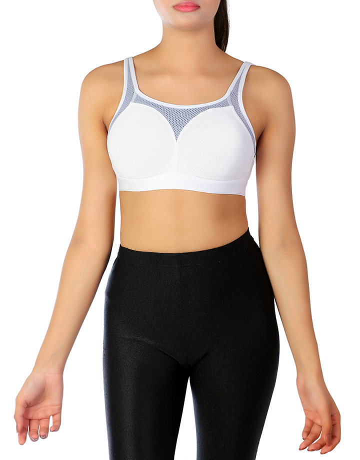 This medium cami bra, sports bra comes with round neckline that provides full coverage. It has wide shoulder straps and wide waist band. The area between the two cups has contrast double layered dotted moisture wick fabric. It has side support and wide wings. This sports bra is non padded, with double layered cups