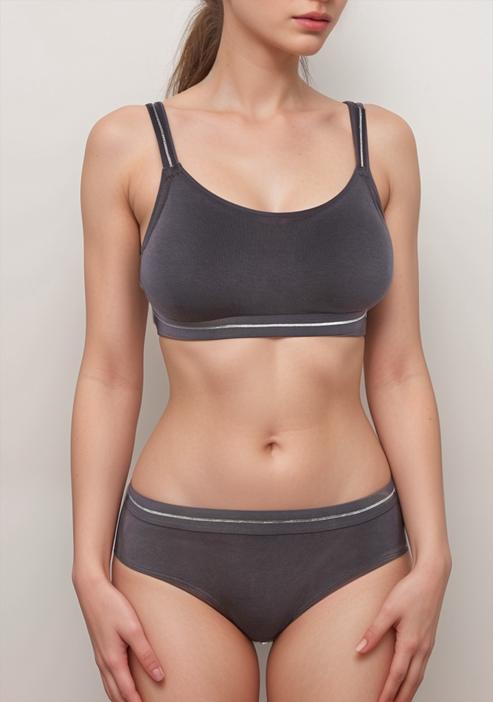 DOUBLE LAYERED COTTON WIREFREE BRA WITH GLITTER ELASTIC WAIST BAND -GREY