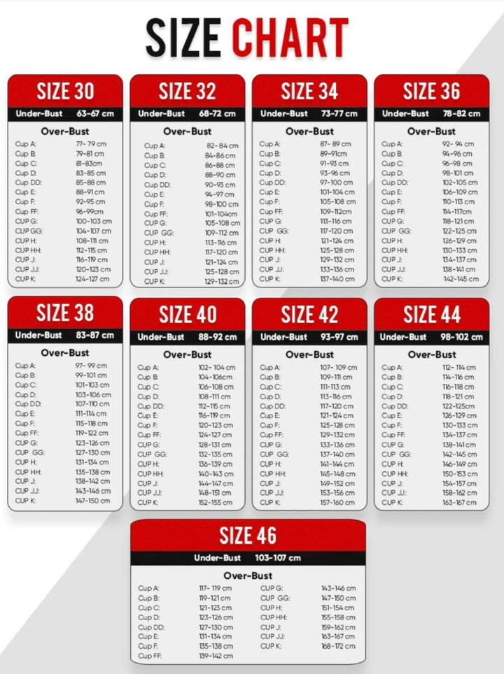 32B, 32C, 32D, 32DD, 32E, 32F, 34B, 34C, 34D, 34DD, 34E, 36B, 36C, 36D, 36DD, 36E, 36F, 38B, 38C, 38D, 38DD, 38F, 40B, 40C, 40D, 40DD, 40E, 40F, 42B, 42C, 42D, 42DD, 44B, 44C, 44D, 46B, 46C |