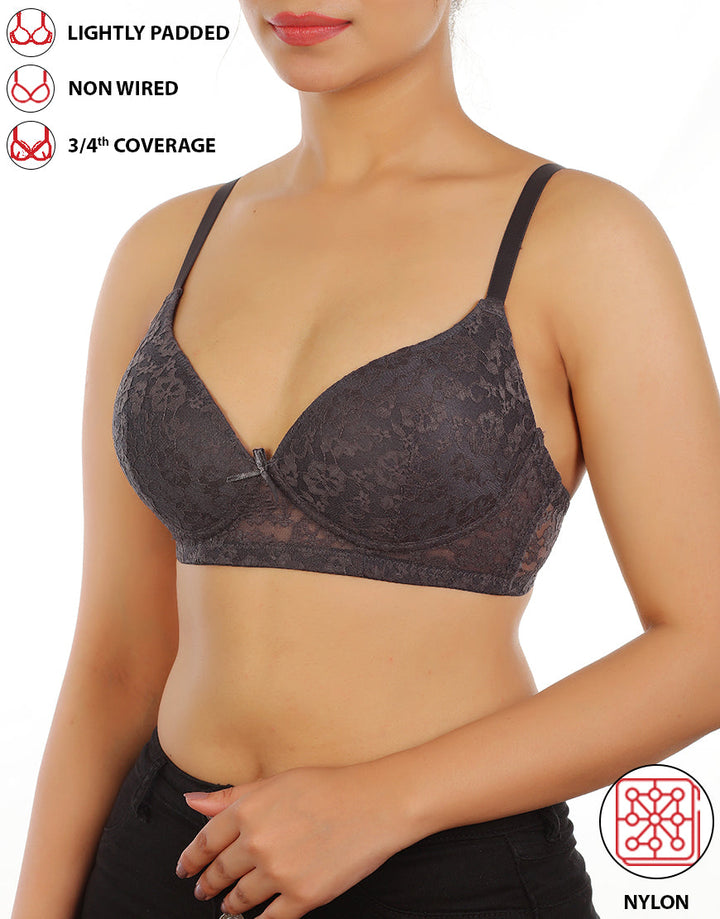 This is a very comfortable everyday wear light to medium padded all over lace bra bra. Padding offers no show nipples under clothes. It is designed with non wire under support for comfort throughout the day. Cups give 3/4th coverage and good for deep necklines as well. It has gradient back straps, the bigger the bra size the broader the band size.