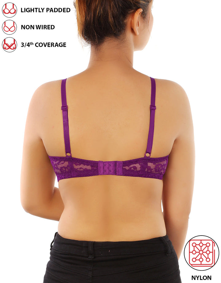 This is a very comfortable everyday wear light to medium padded all over lace bra bra. Padding offers no show nipples under clothes. It is designed with non wire under support for comfort throughout the day. Cups give 3/4th coverage and good for deep necklines as well. It has gradient back straps, the bigger the bra size the broader the band size.