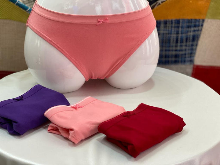 These are a pack of 3 high cut bikini briefs. Come in 3 solid colors. These panties have a soft thin waist elastic band with a full coverage at back. These are low rise with good stretch and maximum comfort.