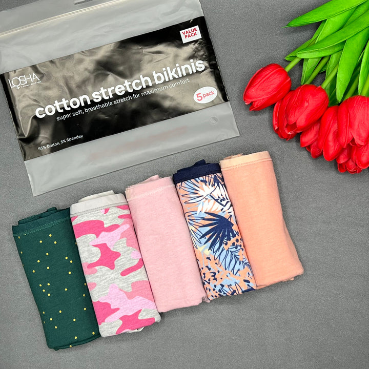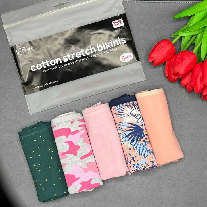 This is a Pack of 5 assorted bikini briefs. All panties have super soft exposed elastic on waistline and leg openings. Cotton fabric is so soft and breathable that you feel like wearing nothing at all. You can wear this panty on daily basis for a whole day without getting irritated.