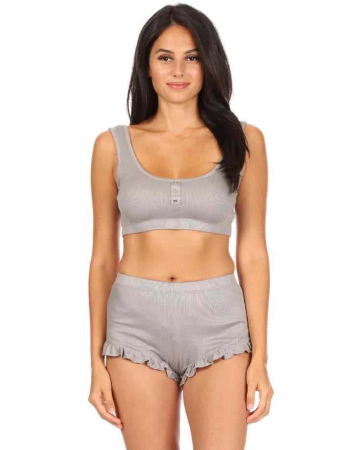This is a ribbed bralette paired with ruffled trim cheeky shorts. Bralette has a wide elastic waist band and is embellished with 3 golden buttons in front middle. Material is really soft for all night comfort. There is no wires or padding.