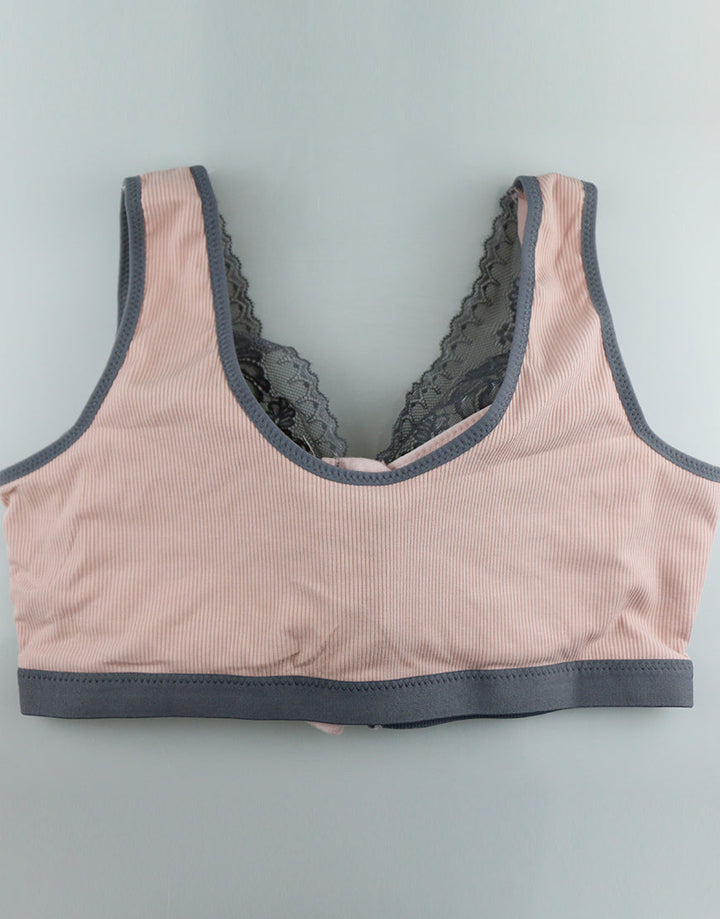 This is a post surgical, ribbed fabric bra with grey colour contrast. It has wide band to provide good support. The front zip adds ease for the wearer.. The grey lace on the neckline adds elegance to the bra. FEATURES: full coverage, front zip, removable pads, non-wired