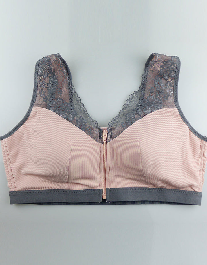 RIBBED FABRIC FRONT ZIPPER POST SURGICAL BRA WITH POCKETS-PINK