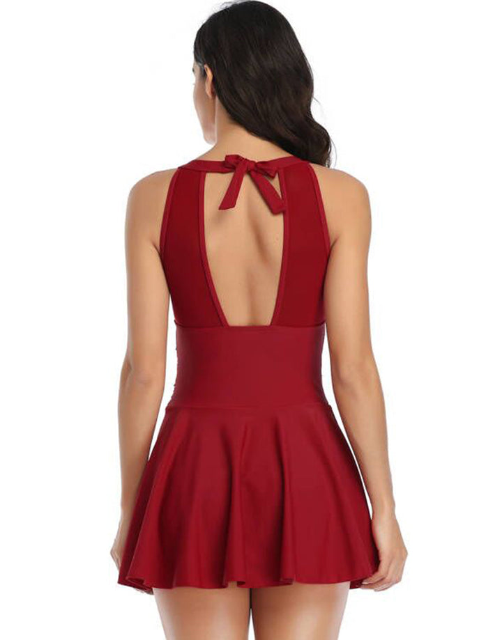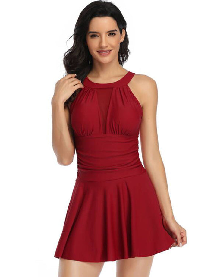 SWIM DRESS WITH TUMMY CONTROL & REMOVABLE PADS - DARK RED