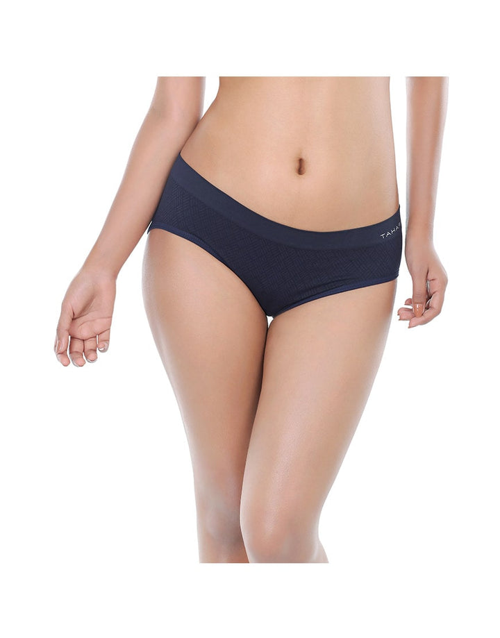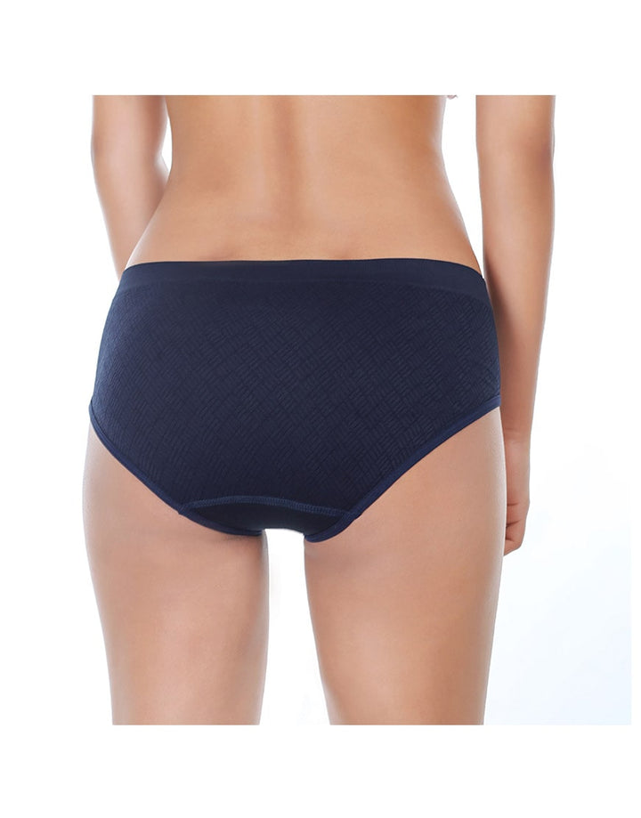 Pack of three jacquard textured bikini briefs with smooth elastic band. Assorted solid colors with lined gusset for maximum comfort.